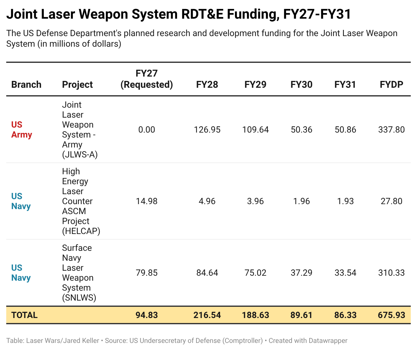 While last year’s Army budget request detailed $51 million in mandatory funding for JLWS through the “One Big Beautiful Bill Act” reconciliation bill under its ‘Expanded Mission Area Missile’ program element, this year’s request does not contain any R&D funding for fiscal year 2027 but details plans for $337.8 million in spending starting in fiscal year 2028 and running through fiscal year 2031. Based on the budget documents, it looks as though the service plans on closing out its IFPC-HEL activities first before kicking off its part of the JLWS effort.