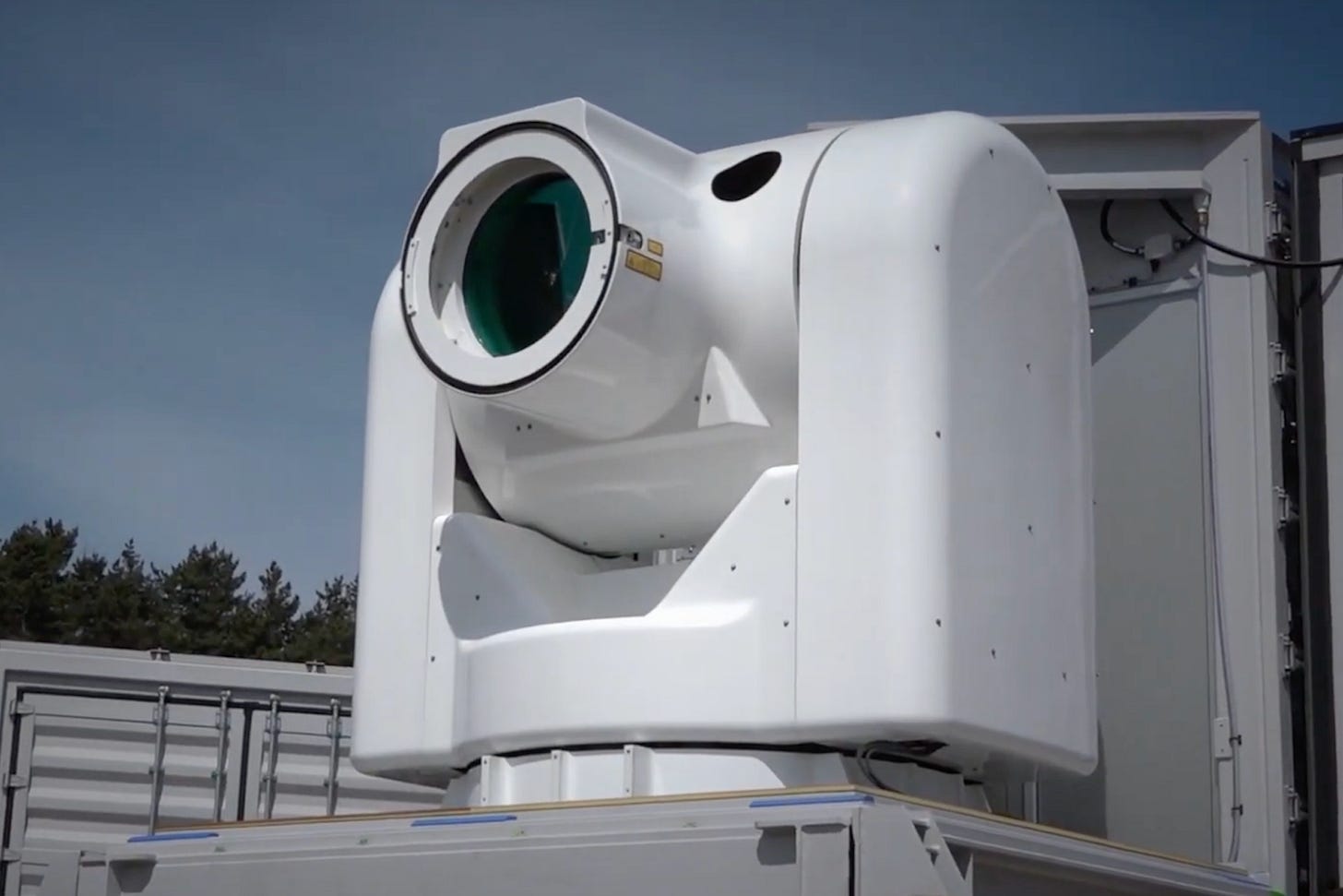 The system, designed to defeat incoming drones and mortar rounds, fuses ten 10 kilowatt fiber lasers into a single 100 kw array, according to ALTA. The weapon appears housed in two 40-foot containers that include a beam director mounted on a sleek white turret along with the requisite power and cooling subsystems.