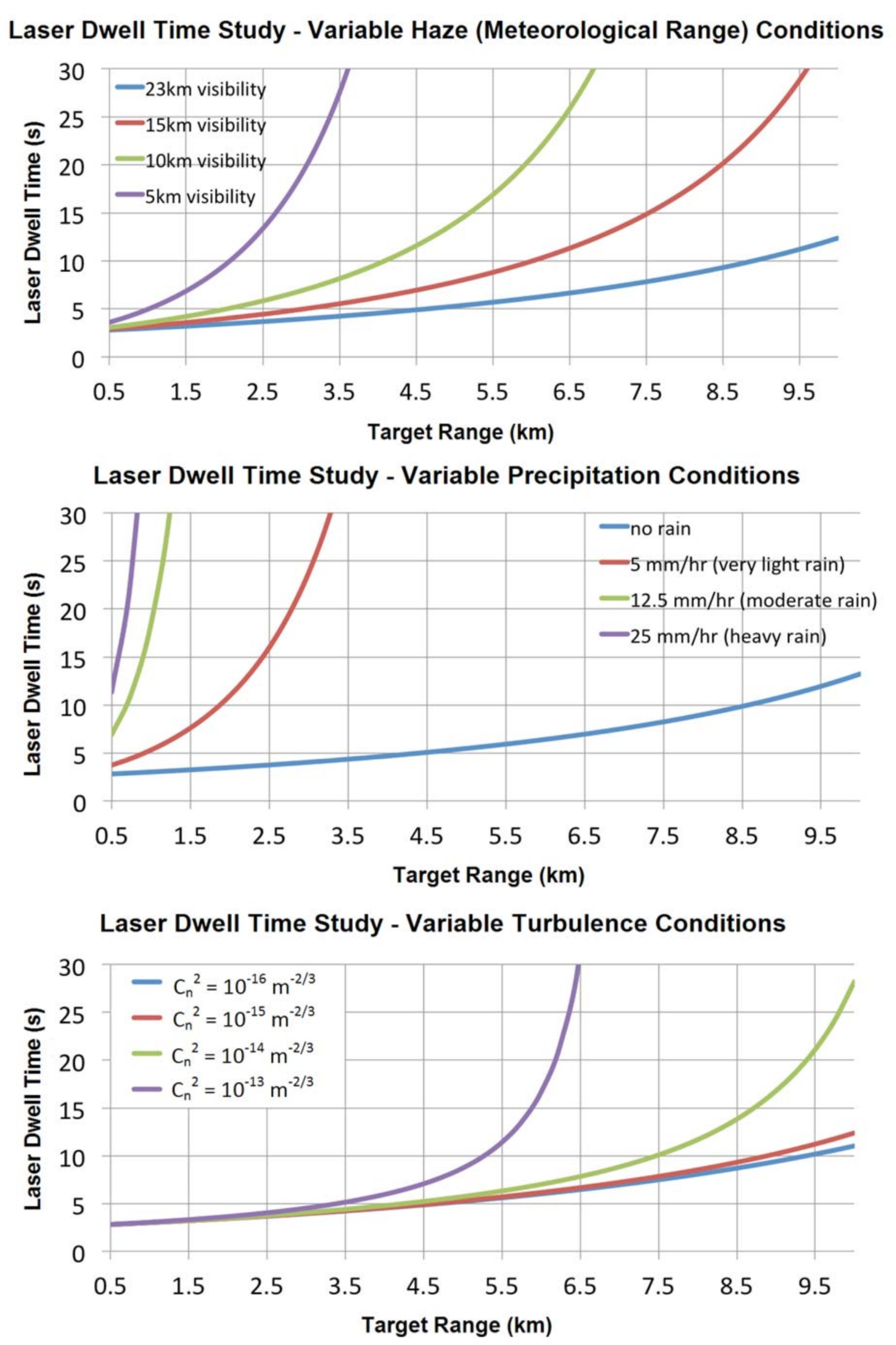 This phenomenon effectively shrinks a laser weapon’s magazine before the system actually fires a shot. A laser that can defeat a drone in three seconds in clear air may require significantly longer in maritime haze or coastal humidity; in some conditions, it may not be able to maintain sufficient beam quality to engage at useful ranges. These charts from a 2014 analysis for the US Naval Postgraduate School illustrate this nicely: