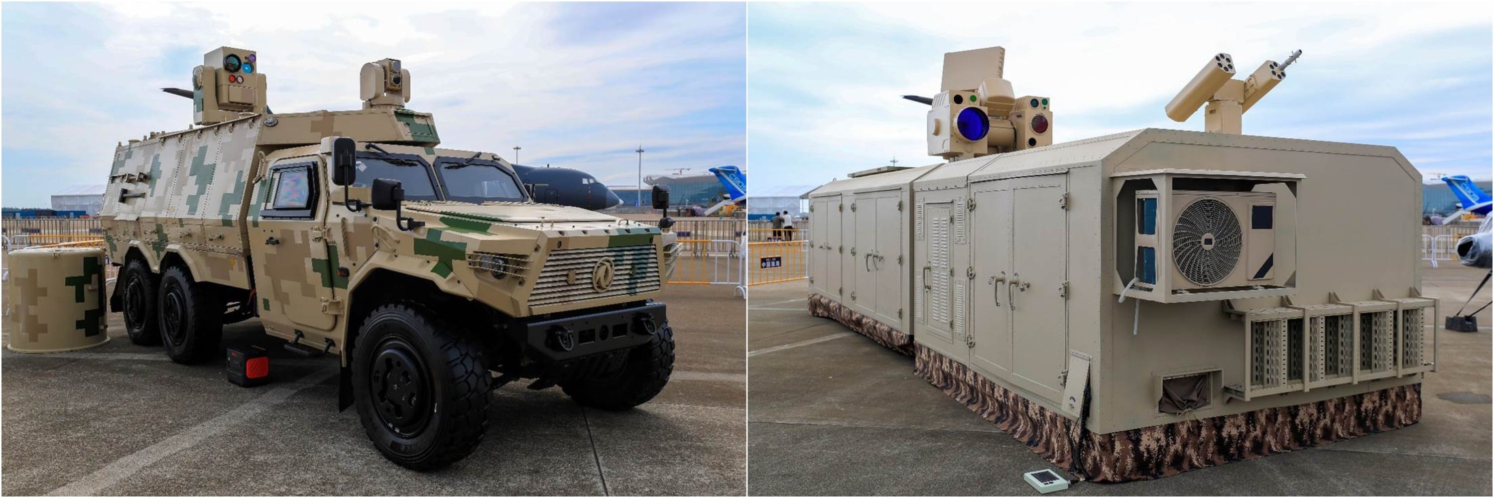 Left: the Guangjian-11E multi-mode composite terminal jamming system. Right: the Guangjian-21A high-energy laser weapon. (Xinhua)